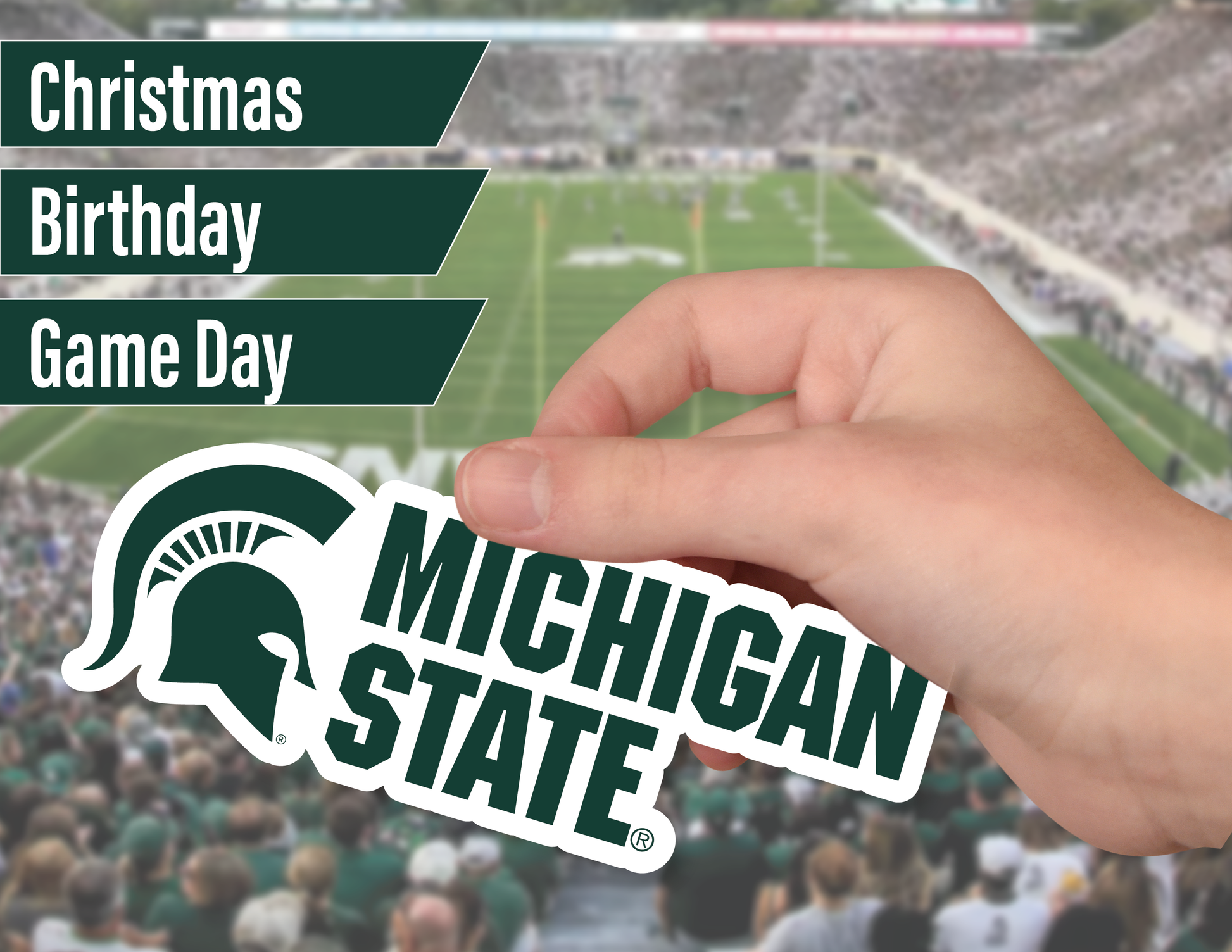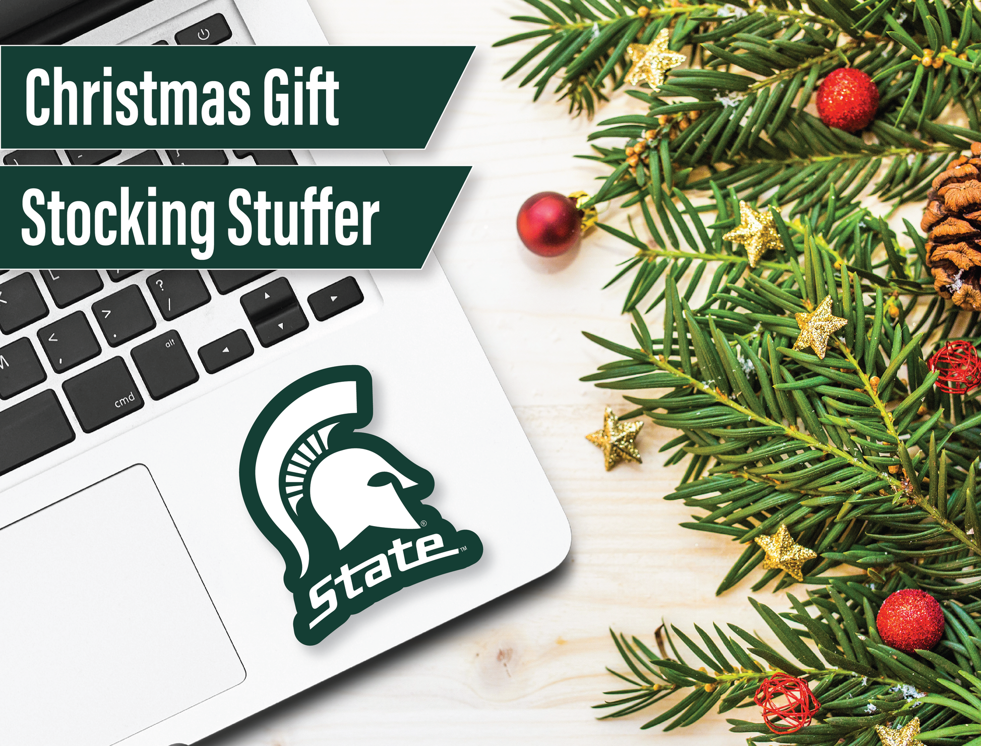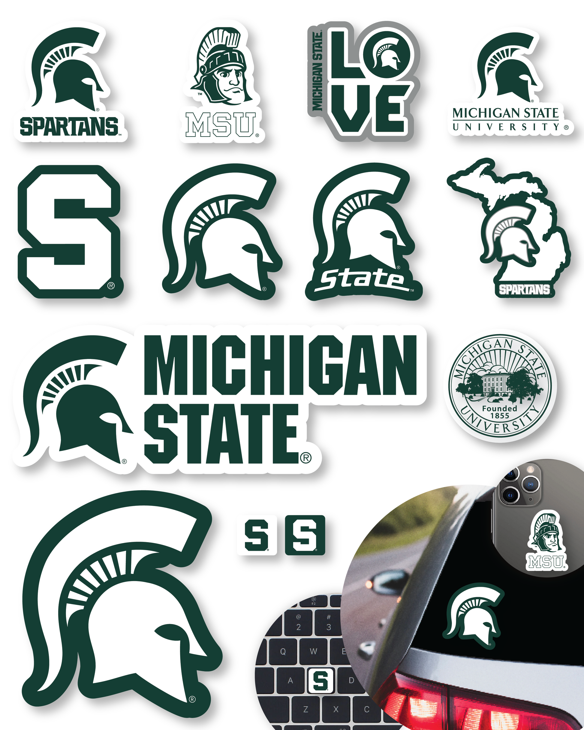 Show your pride with Michigan State University sticker decals. Sticker set includes 10 mug-sized (3 inch), 2 car window sized (5 inch), and 2 keyboard-size (mini) Michigan State Spartans die-cut decals. Michigan State University Spartans decals are UV resistant and waterproof decals perfect for any flat surface including car windows, water bottles, phone cases, laptops, notebooks, luggage, and more. Designed for interior and exterior use. Perfect Christmas, birthday, graduation gift for MSU fans of all ages. Go White! Go Green!