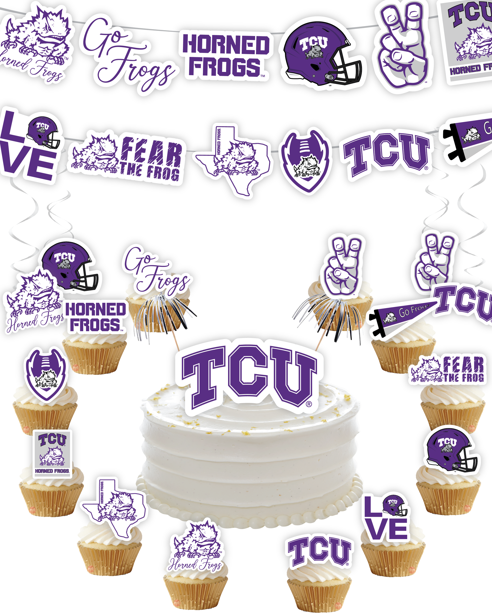 Kickoff your next birthday, graduation, or football tailgating party with TCU Horned Frogs party supplies. This party set is uniquely designed for an effortlessly memorable TCU party. You'll enjoy a variety of licensed design which are precision-cut and professionally printed with vibrant team colors on sturdy, recyclable material. Guests are sure to remember and compliment your TCU party theme. Go Frogs!