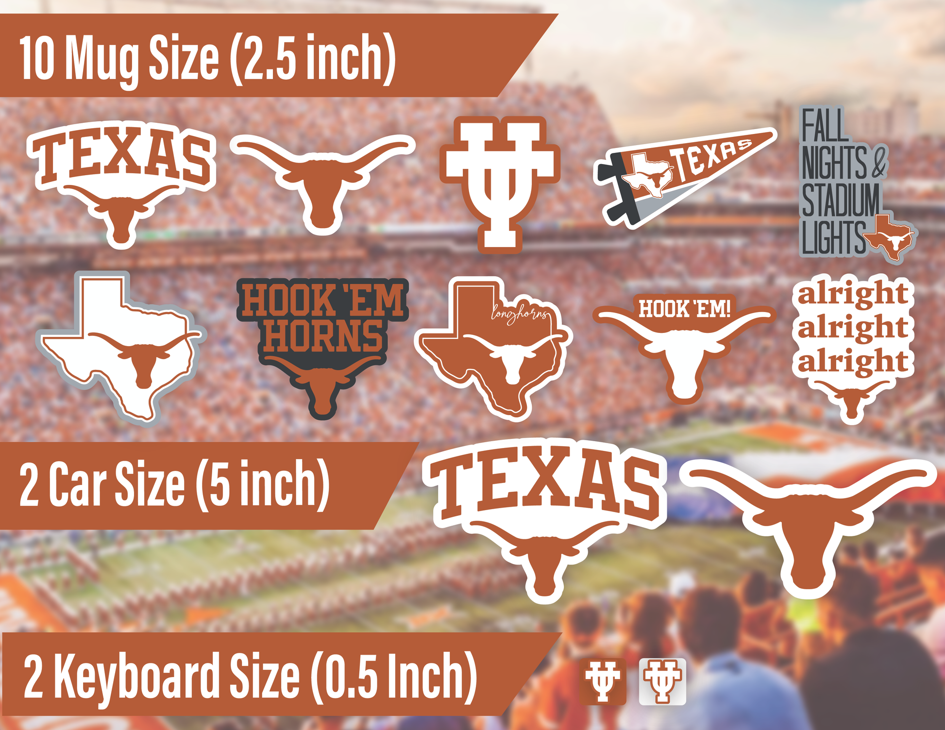 Show your pride with University of Texas Longhorns sticker decals. Sticker set includes 10 mug-sized (3 inch), 2 car window sized (5 inch), and 2 keyboard-size (mini) Texas Longhorns die-cut decals. University of Texas at Austin decals are UV resistant and waterproof decals perfect for any flat surface including car windows, water bottles, phone cases, laptops, notebooks, luggage, and more. Designed for interior and exterior use. Perfect Christmas, birthday, graduation gift for UT fans of all ages. Hook 'em!