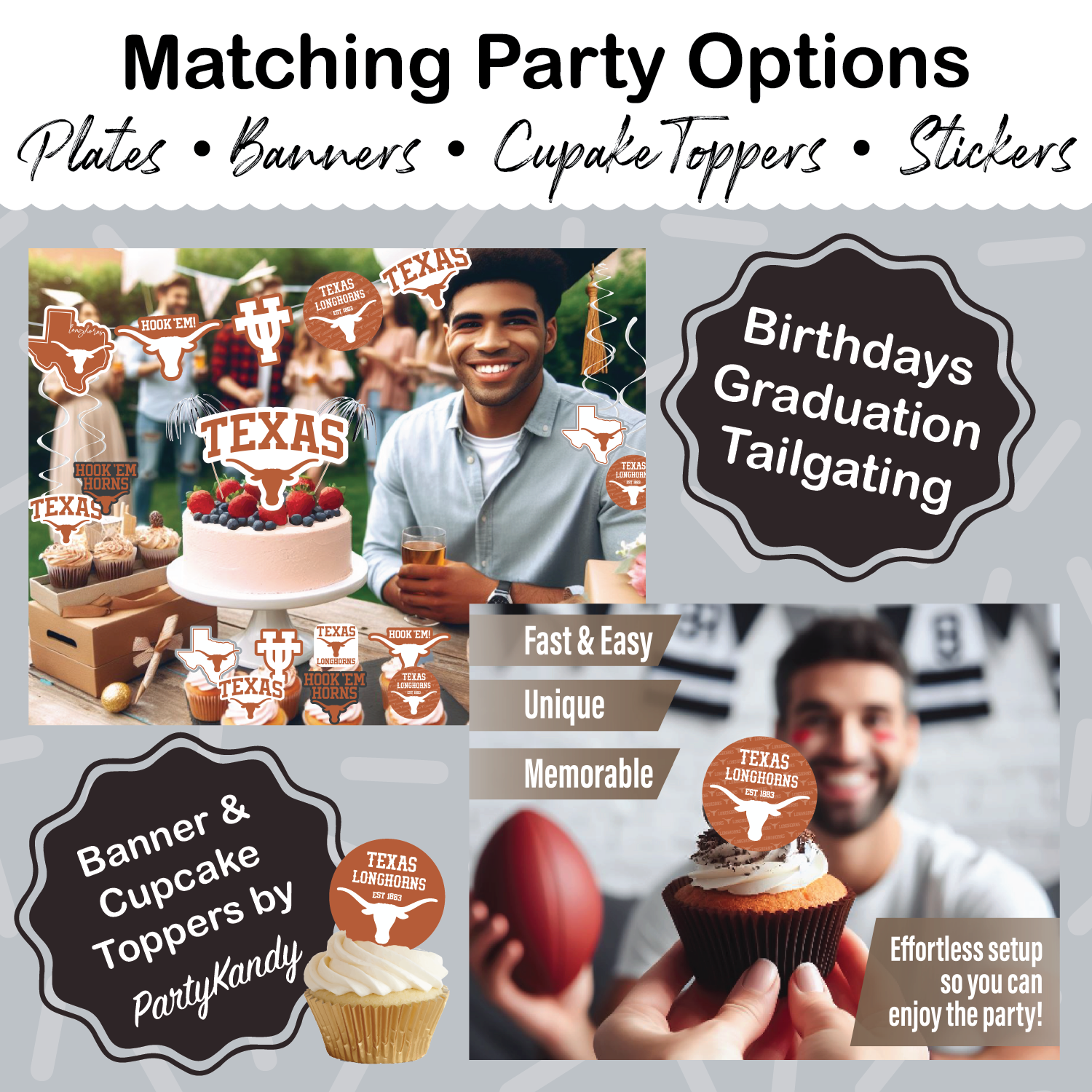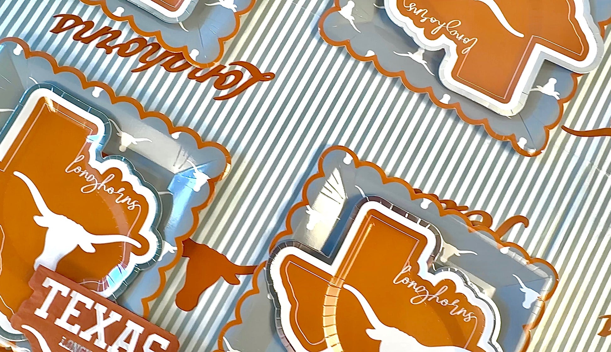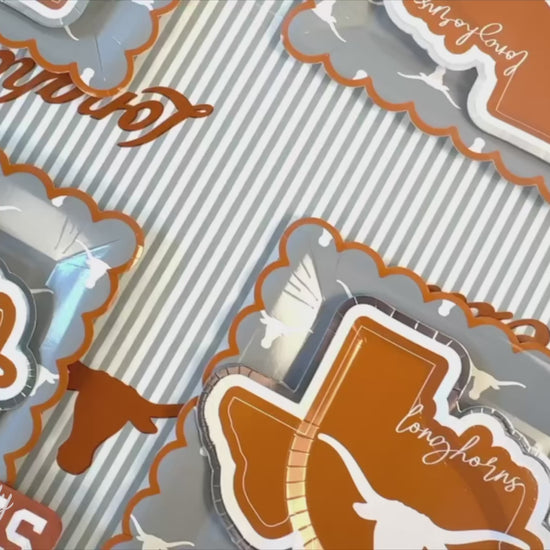 Kickoff your next birthday, graduation, or football tailgating party with University of Texas party supplies. This tableware party set is uniquely designed for an effortlessly memorable UT party. You'll enjoy a variety of licensed design which are precision-cut and professionally printed with vibrant team colors on sturdy, recyclable material with foil embellishments. Guests are sure to remember and compliment your Texas Longhorns party theme. Hook 'em!